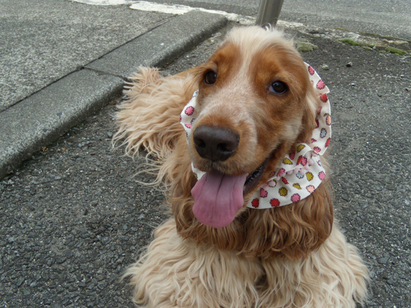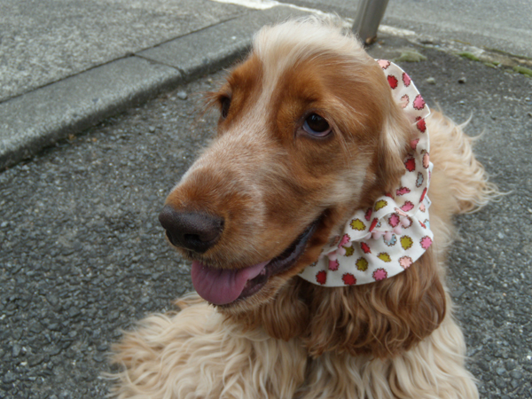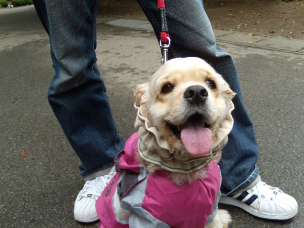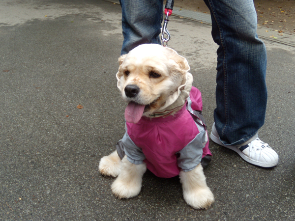 アメコカの小麦ちゃん(2才)がかわいいレンコートを来て歩いていた。