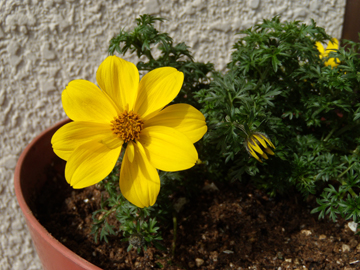 普通のビデンスは冬コスモスとも言われるように冬に咲きますがこれは霜、雪が降る時期以外が咲いてくれます。繁殖大ですからちょっと伸びると芽を摘んであげます。