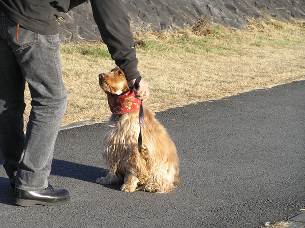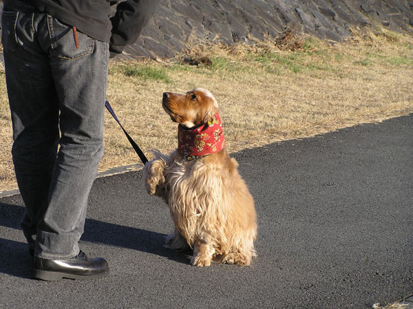 リードが足にからまっているのを直そうしているパパを見て、ご褒美くれる