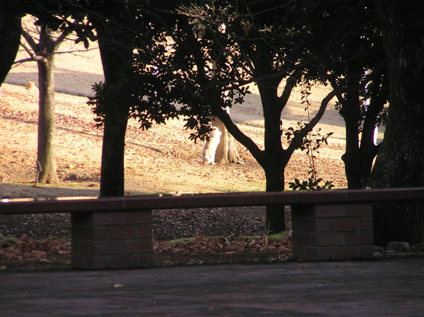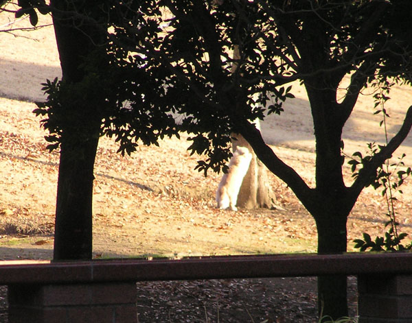 遠くで木の幹で爪研ぎしている猫たんが見えます。