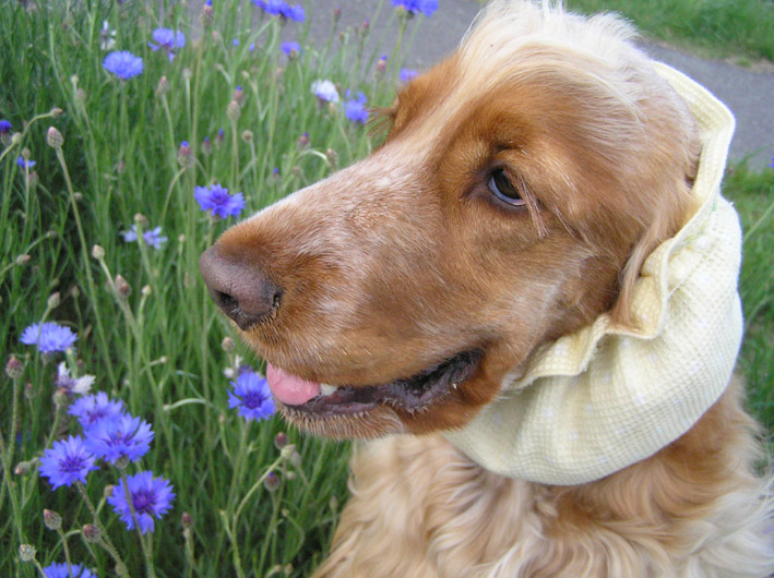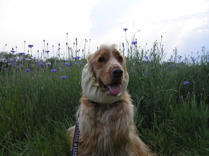 シャンプーした後2日間くらいはスヌードをしてお散歩。