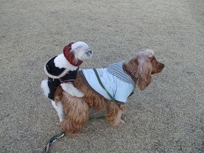 マウントしているのではないかと思うのですが、ビートの体高が高く、腰までふれません。ビートも全然気にならず、歩いています。まるでサーカスの曲芸みたいです。(イッチニ、イッチニ。)