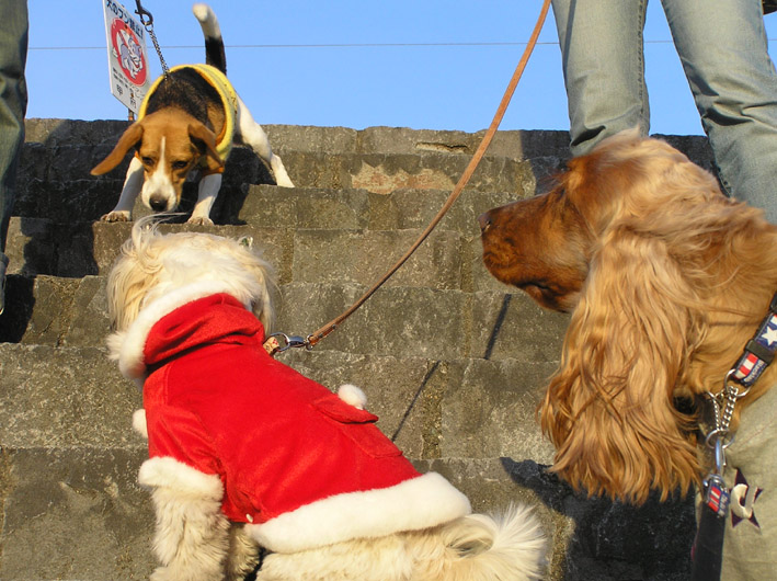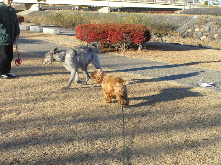 そこへ日曜だけお会いするレイちゃん(ゴールデン)に会う。一緒に遊びませんか?と問いかけて遊んでもらったがとてもおとなしく飼い主に従順なレイちゃんはどう遊んだらいいのかわからないらしい。ビートがしかけてもひいてしまう。でもビートが先に走ると追いかけてくれる。そこでボールをだしてビートに追いかけさせそれを追うレイちゃんを構図に描き、やってみるとバッチリ。初めてだったので少し遊んでお別れする事に!すると、ルビーちゃんがやってきた。先日○ンチに血のようなものが混じっていたので病院へ連れていき、診察してもらうと肛門から枝が出てきたそうだ。枝を食し、腸か肛門あたりを少し傷つけてしまって血がでた事が判明。その翌日にお散歩で大ちゃんママと話しを聞き、その後、○ンチがでていないと言うので大ちゃんママがお腹やお尻をマッサージ。すると5分後くらいに○ンチを出してくれた。○ンチの中には枝らしきものや血はなかったようだ。これで一安心。でも、散歩は注意していないとわからないので目が離せないらしい。頑張れママさん。少し遊びお別れしてビートはパパのリードでお散歩開始。