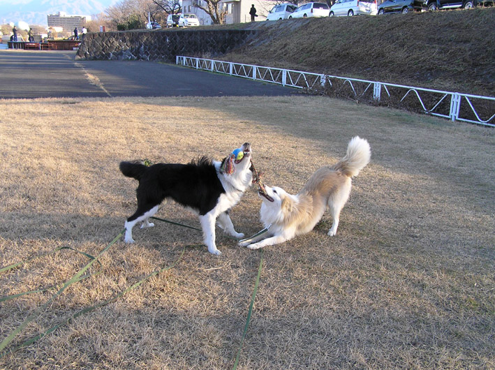 そんな事を2.3回してこれは大変と、ボールが戻ってきてから投げるまでの行動をすばやくしなくては、がんじがらめになってしまうとやるのですが2ワンコがボールを足元であっちだこっちだしているものだから私の手にボールがきません。その内にまた、がんじがらめ!............もう、最後は笑っちゃいました。
