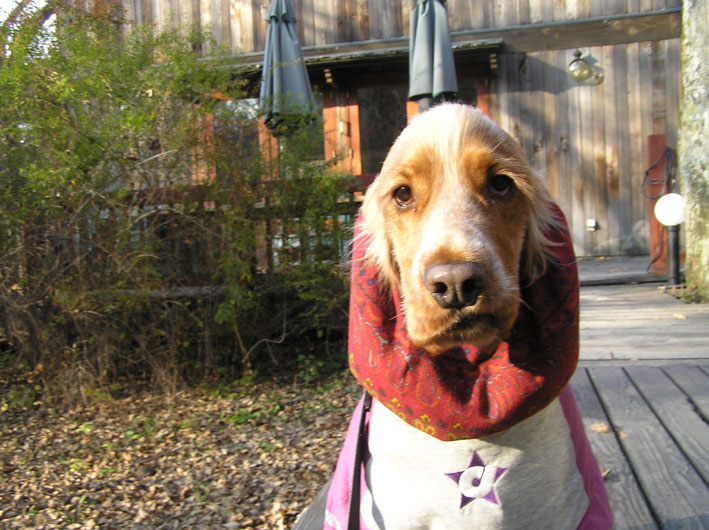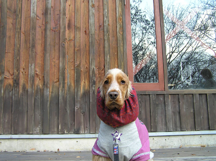 ビートはスヌードをつけるとご飯だと思いおとなしく待ちます。
