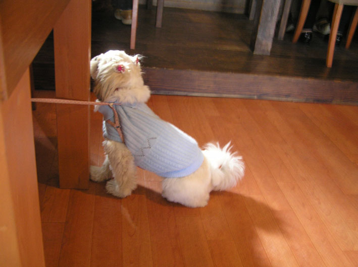 ママの方を見て待っています。でも、テーブルの脚でリードが引っ張られ大変そう。大ちゃん反対側からママを見上げればいいんだよ。