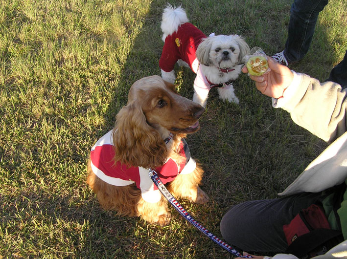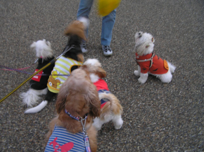 大吉くんママがみんなにケーキをわけてくれています。ビートはおすわり、マテでお利口さんに待っています。みんなはうれしくておすわりしながらも前に前にと移動。大ちゃんママがだんだん遠くなっていきます。