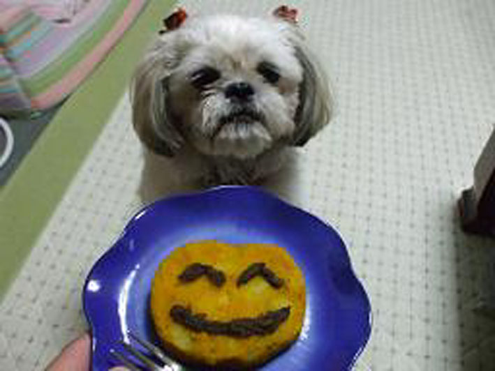 みなさん、かわゆい大ちゃんの方に目がいってませんか???違いますよ。かぼちゃのケーキをよくみてくださいね。目と口がひじきなんですよ。チョコはワンコによくないからと考えてくださいました。(もう、すごい)