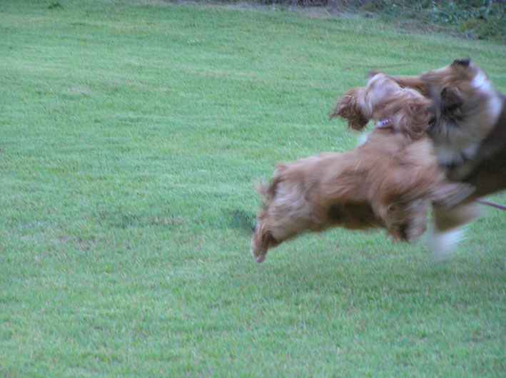 チャイ君の方が大きくなってしまったのですが一生懸命後をついてきます。ビートは遊ぶなら走ったり、ハグハグしたりしたいのですがチャイ君はおとなしく後をついてくるのでビートはどうしていいかわからない様子。