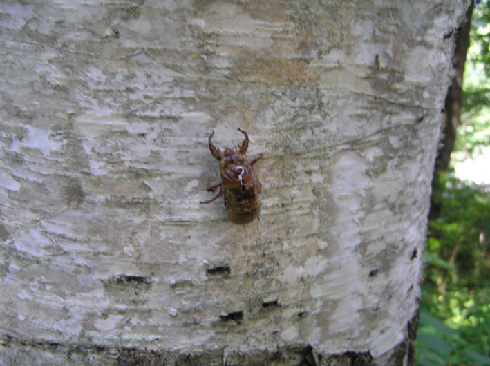 木立の中、ビートと毎日散歩出来ればいいなあと思いながら、白樺の太い幹にせみの抜け殻発見。