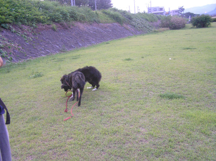 ビートは車の中でもうれしそう。でも、散歩コースに到着したら雨が降ってきてしまいました。ビートのあまりにもうれしそうな表情に小降りになった所を見計らいブチ散歩をする事に。30分弱でしたがボール拾いやディスク拾いをし満足して帰ってきました。足を洗い、ご飯を食べ、またハアハア言い出しました。我が家の温度29℃なんだ、今夜も暑く寝苦しいのかな。