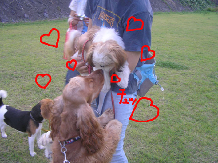 後から合流したりんまるちゃんたちにご挨拶していつものりんちゃんではない事に気づいたみたい。りんちゃんはヒート中なのでだっこしてもらっていた所をクンクン、チュッ。あら、おかまのくせに恋しちゃったのかな?