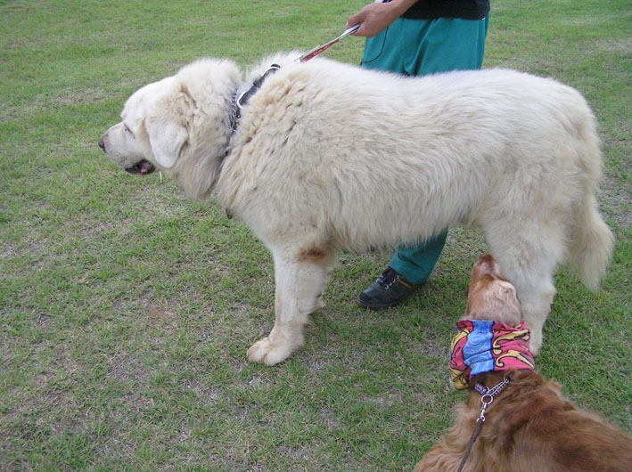 おっと、突如、巨大型犬のディンボ君(ピレ♂)60kgもあるそうだ。今日のビートはおとなしく臭いを嗅ぐだけ。
