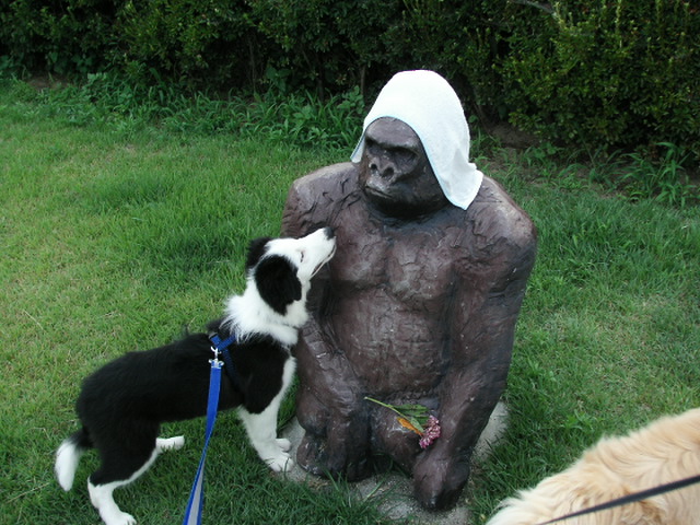 ビートにも怖いものがあったのか。どこが怖く見えるのだろう。我が家には将来、口から火を吹くガメラもいる(陸ガメの事)。そしてクマもいる(パパの事)。他に怖いものなどないはずではないか。取りあえずだっこしてゴリラさんの頭をポンポンと前足でたたかせてみた。抵抗なくしたので降ろしてみるとほんの少しだけクンクンしてすぐへっぴり腰で遠ざかった。
