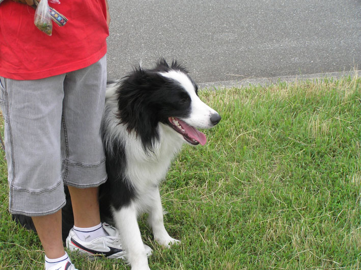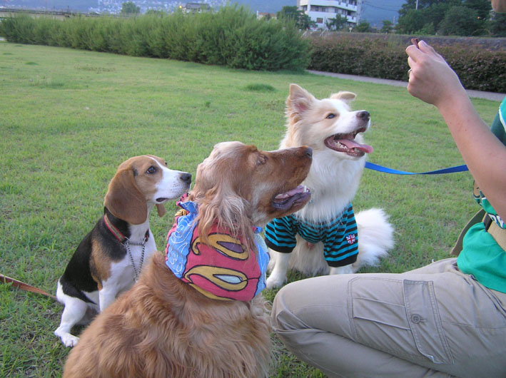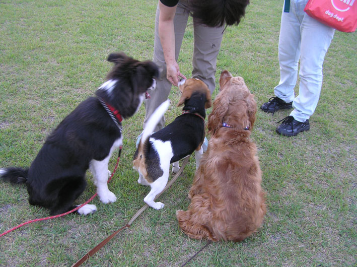 ノソノソビートがこの時だけは違うが何回もしている内にゼンマイ仕掛けがきれてきたようにテンポが遅くなる。ボーダー君たちはまだまだこれからのような意気だがその辺を見計らわせてもらい、呼び戻す。ビートはスタスタと戻ってくるつもりでいるようだが相手がまだまだと絡んでくるので両方の名を呼んであげるとちゃんと両方が戻ってきてくれる。そして、戻ってきたご褒美におやつ。(戻ってきてくれるのはおやつの砂肝のせいかも)