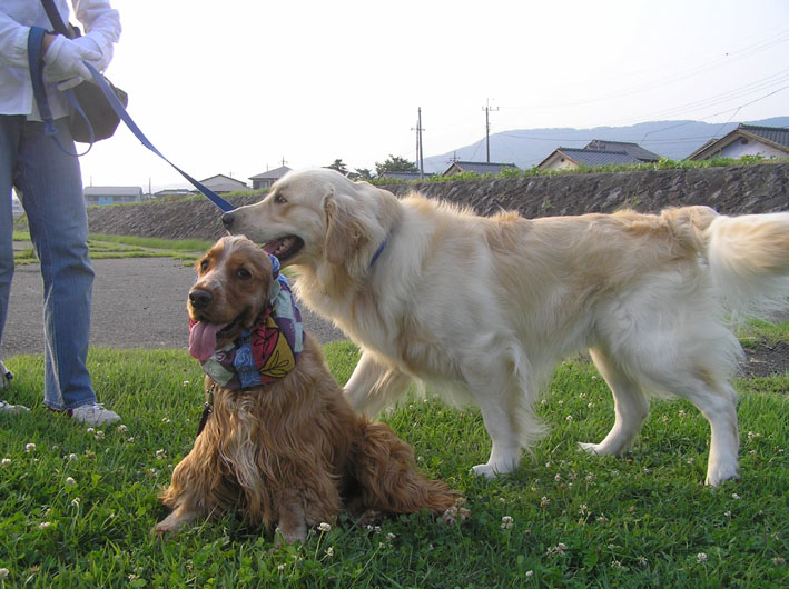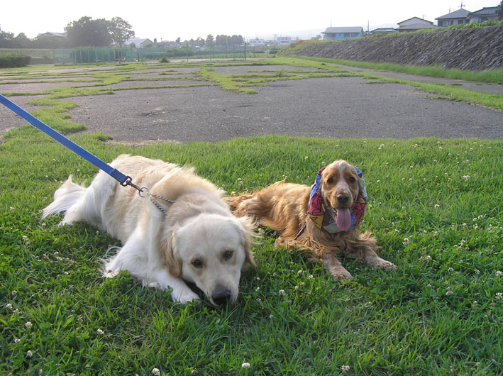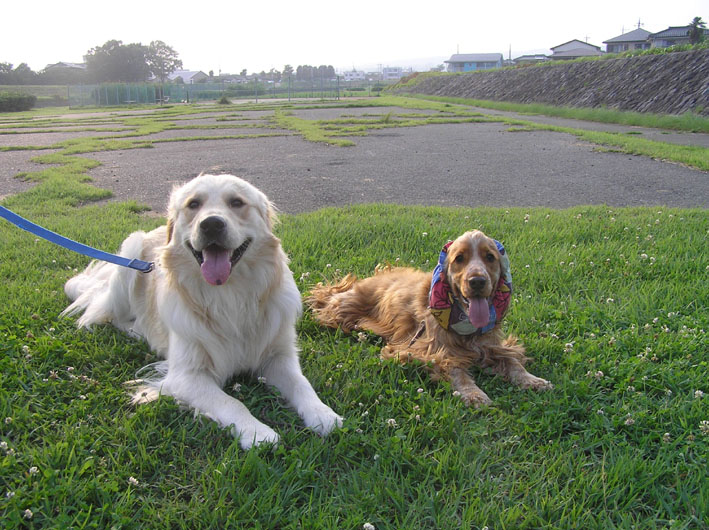 河川敷について、歩く事たったの1分。A・コカのチア君に珍しく会う。話しがはずみスヌードの事や、夏の手入れの事とか、いろいろお話をしてしまった。その間ビートはクンクン。チア君はビートの様子を伺いつつもチアママの側に付きっきりのお利口さん。ビートはチア君が遊んでくれない事を知っているのでチア君にそっけない。そこへ仕事帰りの我が家のクマさんが登場。ビートは思いっきり、家に帰って来た時と同じようにクマさんをなめまわし、しっぽの振り回し加速全開。チア君は圧倒され、思わず引いてました。