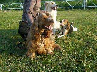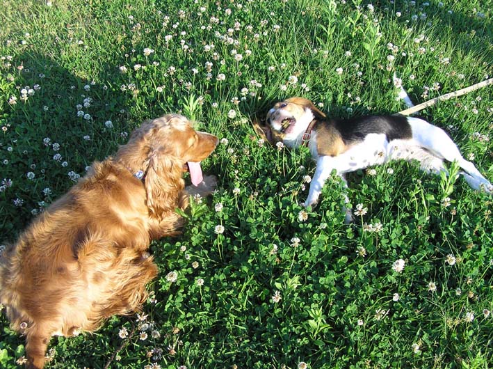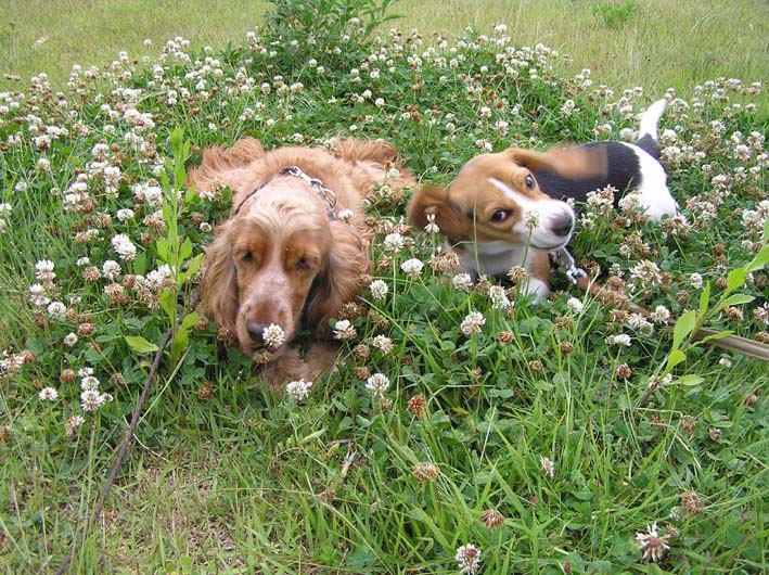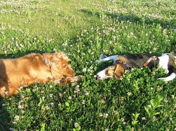 散歩コースについて、意外にすぐウ○コをするビート。いきばりますといきばった目の先にクロロちゃんが待ち伏せ。こんにちは。今日はお母さんと一緒のお散歩。ビートとクロロちゃんの激しい遊びが始まったと思うとそこにチャイ君がどこからでてきたのか乱入。(チャイ君はビートが大好きなのか必ず会うとズーとくっついています。)そのチャイ君も一緒になって走りまわりっていると小さいミニチュアダックスのチョコちゃん、なんか危なそうと思っているとシロ、太郎、ボブあれあれ、なんだかわからなくなってきたと思ってビートを呼び寄せようとしたら、ルビーちゃん。あっちで走りまわり、こっちで走りまわり、これはしっかりとビートを呼び寄せなくてはと呼ぶとて私の方に向かってくる。すごいぞビート。が、途中でクロロちゃんアタックが入り、またもや、一回りし、私の方に向かってくる。よしよしいい子と思っていると今度はチャイ君につかまりまた一回り。ビートの戻ろうとしている行動だけでも認めてあげなくてはとこちらからも、ビートのいる方に歩みよって、ご褒美を与える。ビートもかなり疲れたようだ。さあ、散歩をしなくてはと歩き始め、チェル君に会う。チェル君とルビーちゃんとビートでいつもの場所まで歩こうとしたら、ビートが白詰草の上でバタンキュー。
