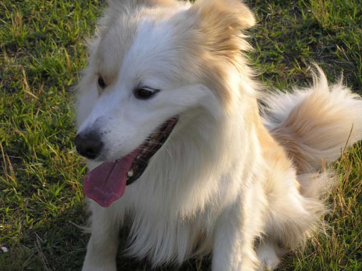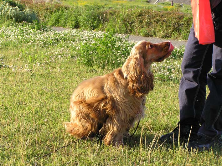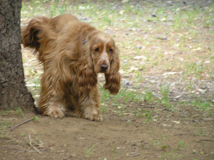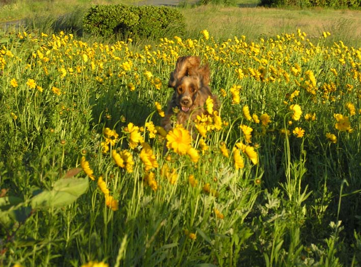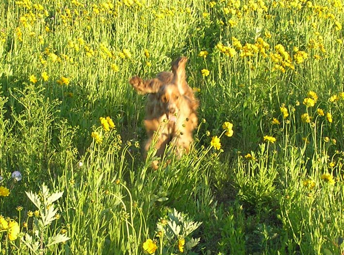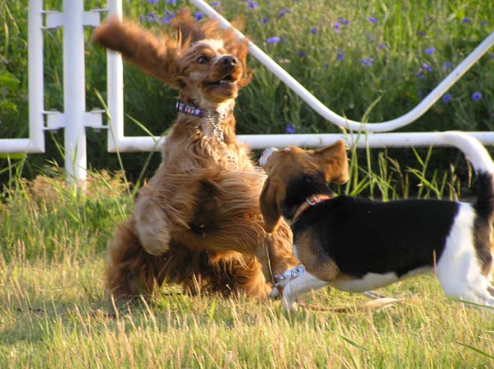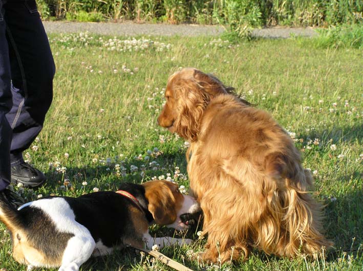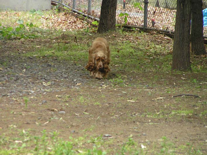 散歩でチェル君がいつもの遊ぶ場所にいました。見つけてビートにさあ、行っておいでと言うと、サササと走っていったはいいけど、途中足が停まり伏せして構えています。その後、おそるおそる忍びの術のように、忍びより、チェル君である事を確認。すると、両方が劇的な再会のように走りより体当たり。すると、私の方に今度はチェル君、ビートが走ってくる。シャッターチャンスをねらって押しましたがすでにその場所にはいない。あまりの速さに草のみを撮ってしまい、そのかわりに私に激突してきました。すごい力で押し倒されお尻をついてしまいました。(もしかして、私も仲間???)