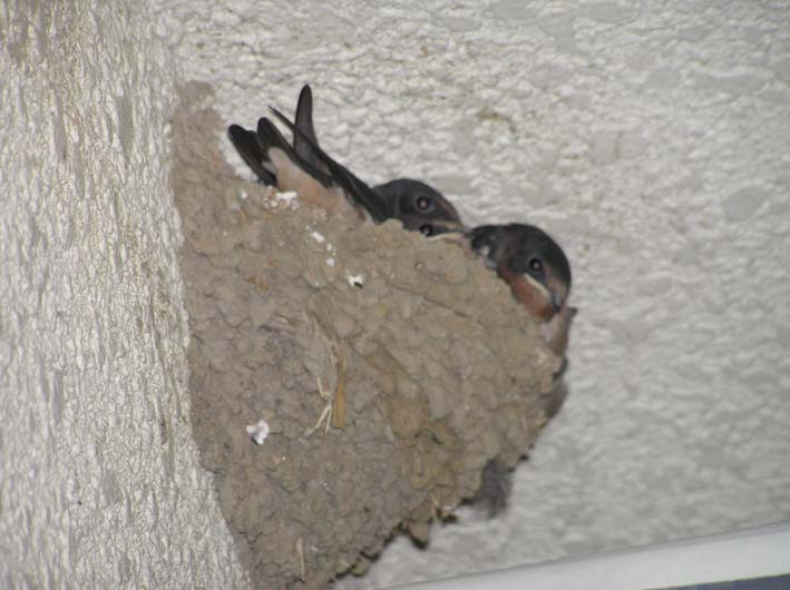 ツバメさんです。玄関の軒先に毎年やってきます。そして、ここから巣立ったツバメさんはこの4年の間に40羽以上。今年も4月にやってきて、5羽育ちました。もう直き、巣立ちです。すると、もう一度卵を産みます。ひとシーズンに2回か3回卵を産み育て、巣だっていきます。毎回同じ夫婦がここをお家にするのかわかりません。もしかしたら産まれた子供たちの誰かかもしれません。(ツバメの寿命はどのくらいなんだろう?)玄関下、玄関照明、そして、車などふんや、巣にするためのわら、土、子供に与えるための虫の死骸などで汚くしてしまうのですが、仕方がありません。私たち家族より前からの住人なんですから。この地に住んで驚くことばかりでしたが、ツバメさんもそのひとつ。これからもお世話になりますがよろしくお願いします。
