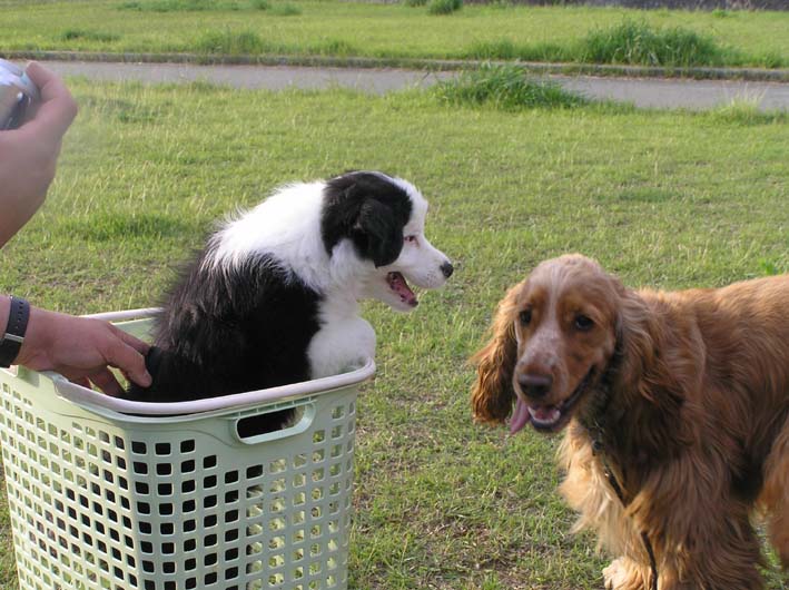 ダダダダーと走ると今日は暑いのでみんなハアハア。お水を飲んで、お休みタイムです。ワンコ達は急に真夏並みの暑さに少しバテぎみなので、早々にきりあげる事にしました。帰り際、昨日に引き続き、ルイ君に会い、ご挨拶。