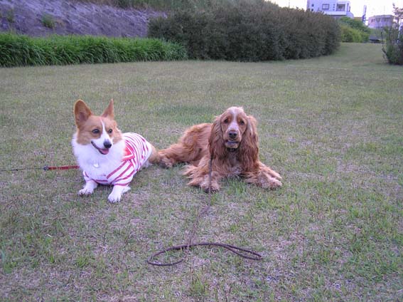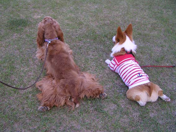 すると、志庵ちゃんに会い遊んで一休み。またまた伏せポーズで、遠くを見ています。それもおそろいで。かわいいので写真をパチリ。