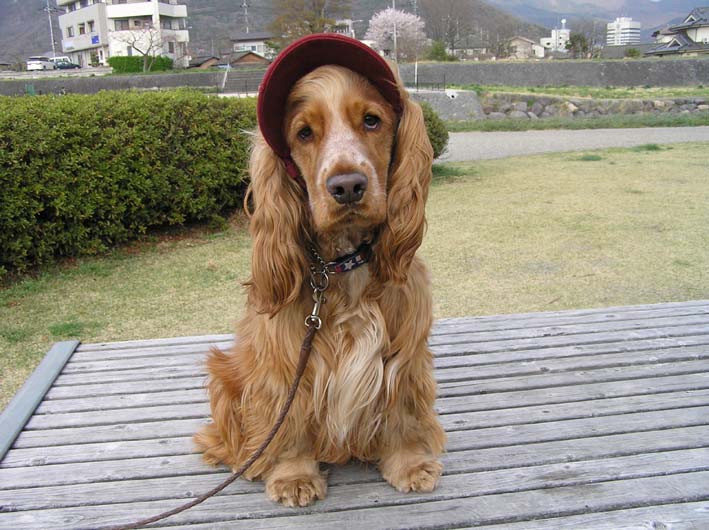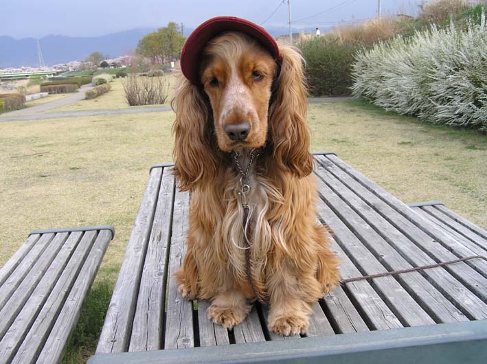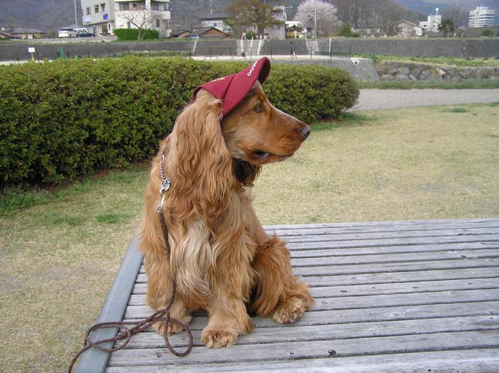 河川敷にでかけると雨。雲をみると、北西の方は晴れています。雲の流れからみると、今降らしている雲が通りすぎれば、お散歩できる状態かもしれないと思い、それまでペットショップに行ってました。トイレシートと迷子札(お散歩であばれまくるため、無くしてしまいこれで3個目)を買い、ビートがお世話になったおにちゃんだち(ビートをこのお店でみつけた)に大きくなったよのご挨拶をし、さあ雨もあがったかなあ〜とお店を出ようとした時、目にとまってしまった帽子。ちょっといたずらにビートにしてみると、笑っちゃいます。かわいい〜。(ここでも親バカ)