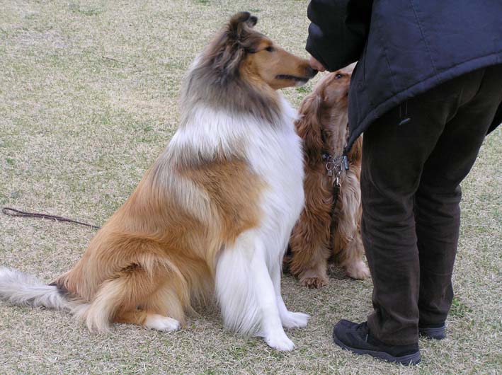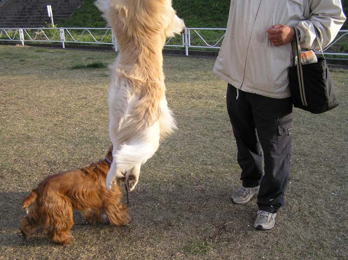ビート良く見て。ビートもやってみようよ。と、ビートをみると、反対方向を向いて一点を見つめています。向こうからくるのはボブとボブママです。ビートは跳んでいき、ボブにチョコっと挨拶して、その後ボブママにおねだりです。いつもすみません。たくさんおやつをいただいて。ペコリ。そして、お別れ。ビートはいつまでもいつまでもボブママの行方をみつめていました。車を置いてある所まで帰ってくるとふるちゃんとバッタリ。では、また遊んじゃおうと少しではありましたが遊んじゃいました。