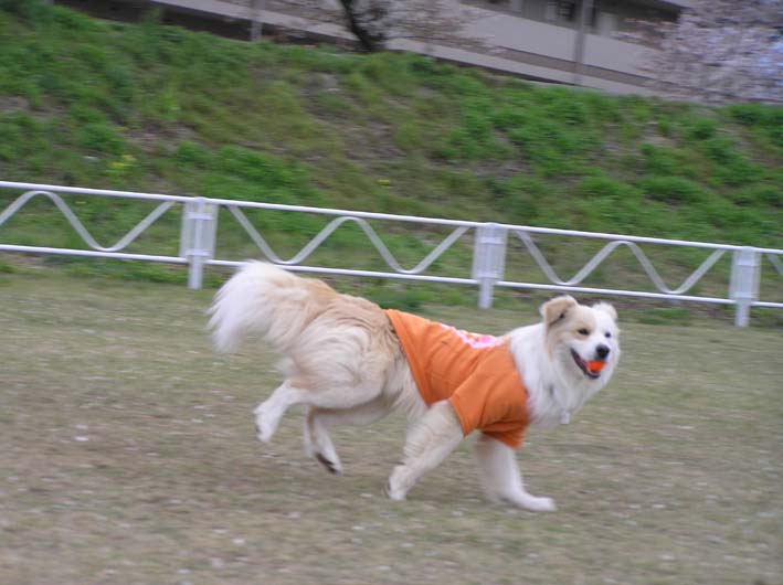 もいない。いつもの場所でボール投げをして、ビートとフルに遊んじゃいました。ボールを投げる時は以前より前にでるけどまだ遅いなあ。そして、ボールが跳ねた時に、キャッチする事を覚えてきているけど、うまく加えられず、落としちゃいます。(犬にしは、運動神経が悪いかも。)、ボールをとってからの戻りものろまちゃんでトコトコトコ。まあ、いいか。楽しんでいるようだし。愛嬌愛嬌。