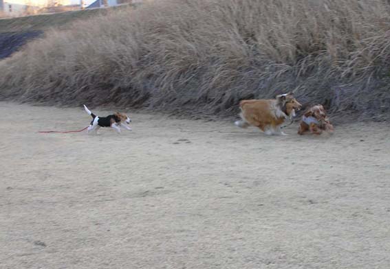 側にくるとすぐお鼻とお鼻とのご挨拶。もう、その後は遊ぼ攻撃が始まりました。少し慣れた所でリードを持つ手を離してあげました。(リードが絡まるのでと言うのが正解かな)とてもやさしくビートの遊ぼの挑発にのってくれ、ルビーちゃんもクロロちゃんを嗅ぎまわり、すぐ遊びに参加。ほんとビートは幸せものです。こんなに動きまわれるなんて絶対ありえないと思います。ドッグランでも遊びますが、毎日はいけないし、その時のドッグランに集まったワンちゃんがみな友好的ともかぎらないのであまり遊べず帰ってくる事もあります。散歩で仲良くなったお友達と遊ぶのがなによりです。本当はリードを外してはいけないのでまわりを気にしてではありますが、でもかなりの運動量です。と思っていると、チェル兄貴が・・・。チェルとクロロでご挨拶。
