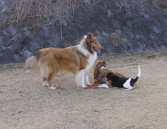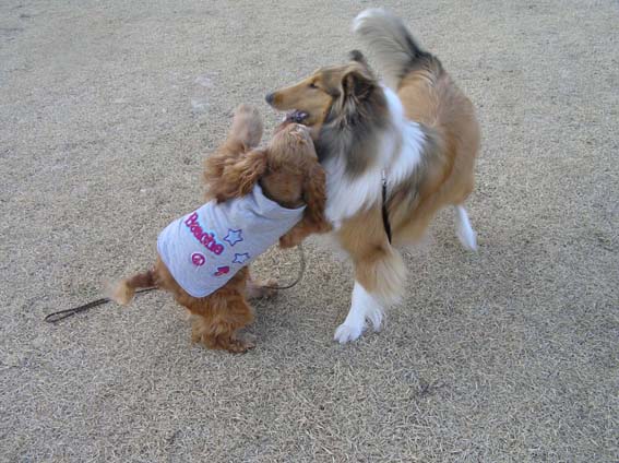 フリルちゃんが大きいからと言ってかなり心配してくださいました。でも、ビートの方がやんちゃなのでかえって遊んでくれるワンちゃんが心配です。フリルちゃんは本当におとなしいやさしい子です。でも、大きいからなおさら、気使いもたいへんな事とマナーを徹底させるしつけがたいへんなんだなあ。と新ためて知りました。本当は大きいからではなく、ビートにもそのようにしつけなくてはいけないのでしょうが・・・。思いっきり大きいワンちゃんともこれからも遊べるようにするために、ビートもしつけて行きますのでまた懲りずに遊んでください。家の中ではコマンドも聞くのですが一歩外に行くと舞上がるみたいなんですがどうすればいいのかなあ。