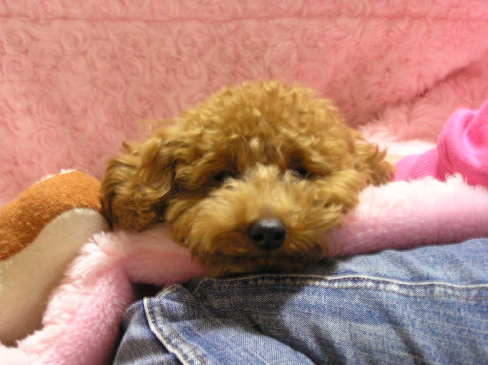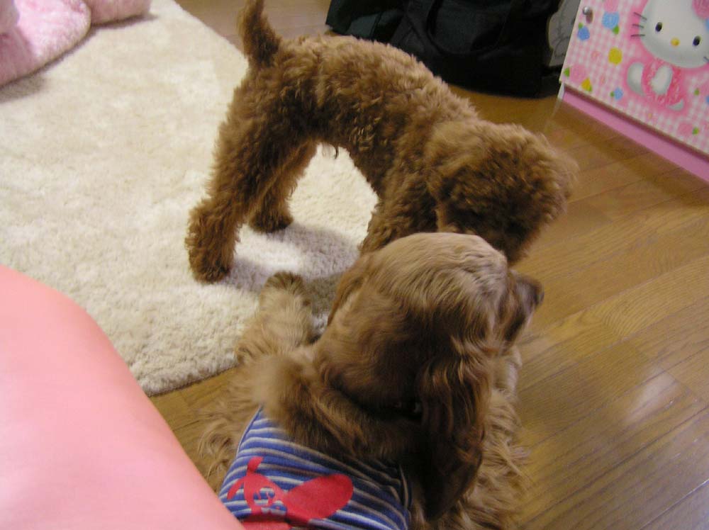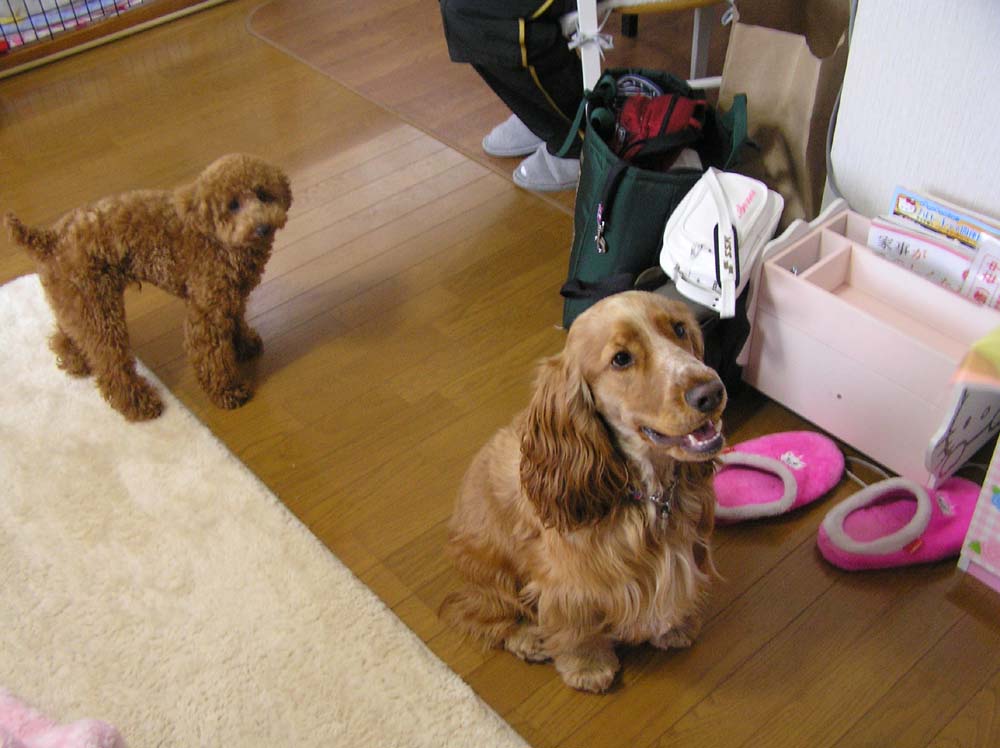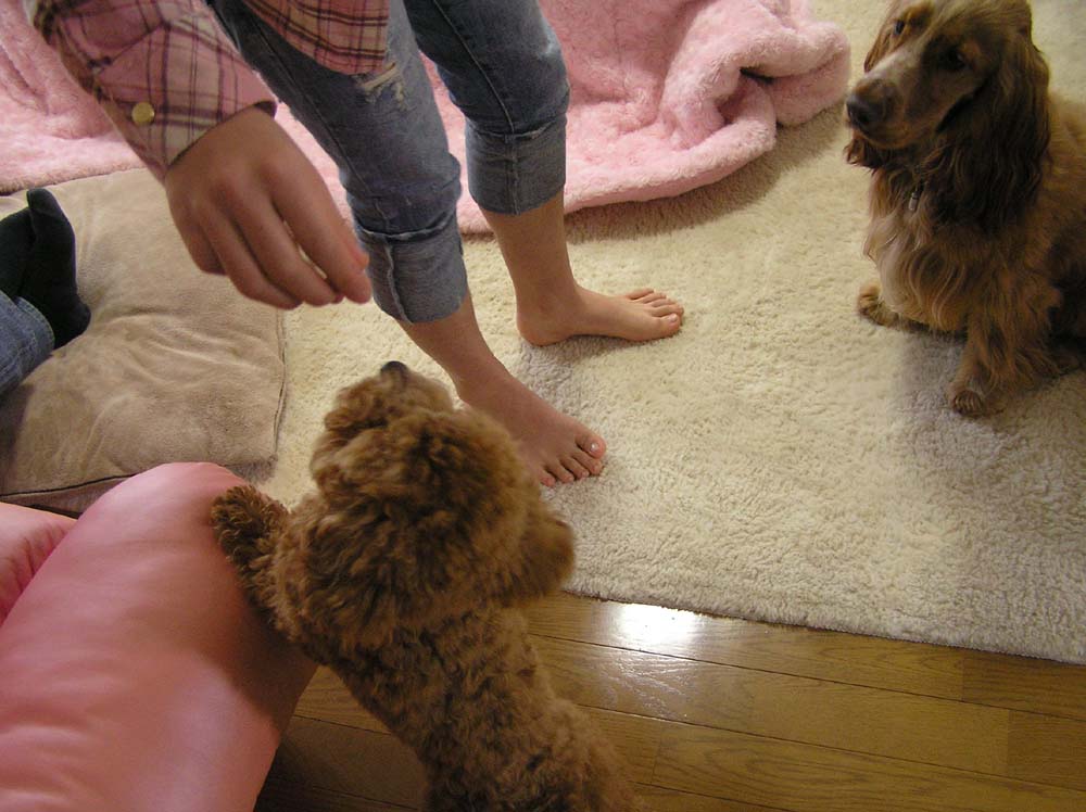 U家はKID(トイプーの男の子10ヶ月)がいて、ビートも楽しみ!ついたらいきなりお遊びモード。KIDは、しっぽを丸め、抱きかかえられ震えていました。でも、少しづつ慣れてきて、恐る恐る近寄り、ビートが向き直ると逃げるといったかんじが続き、その後はビートの後ばかりくっついていました。がんばったねKID!