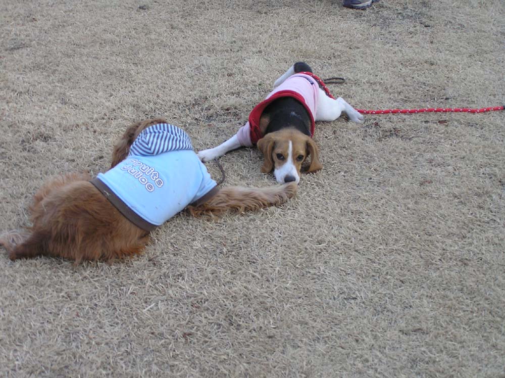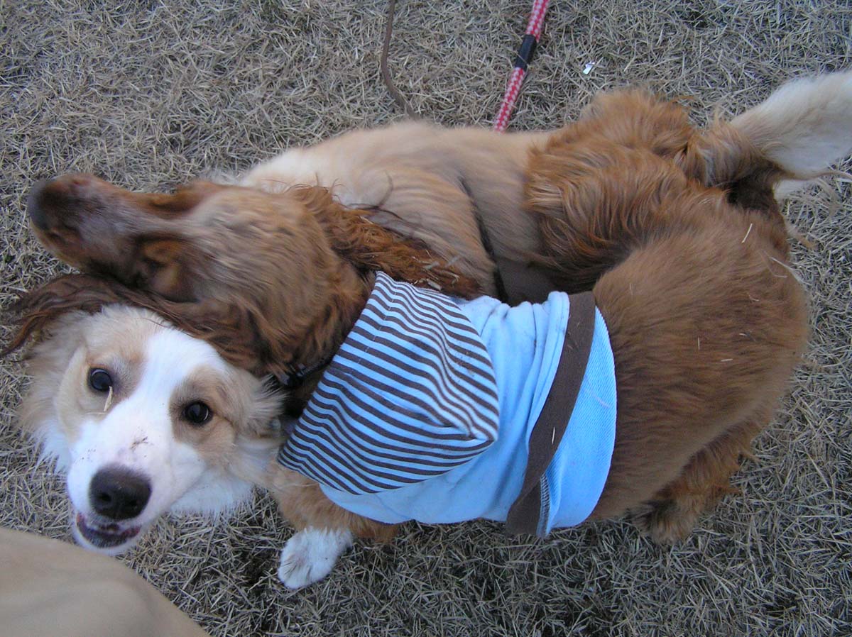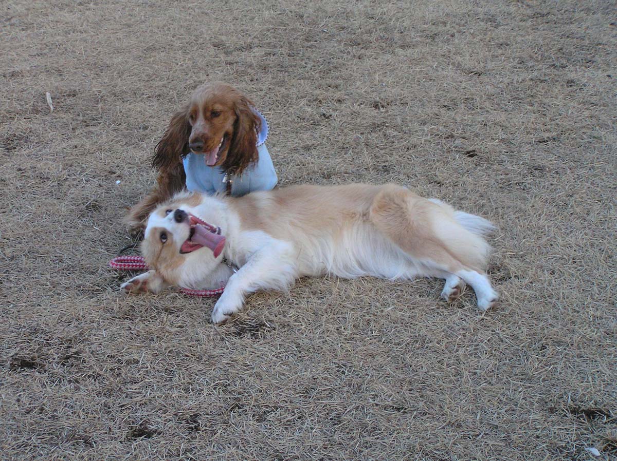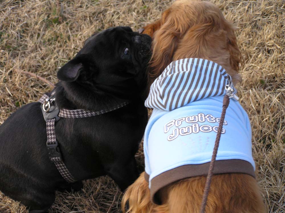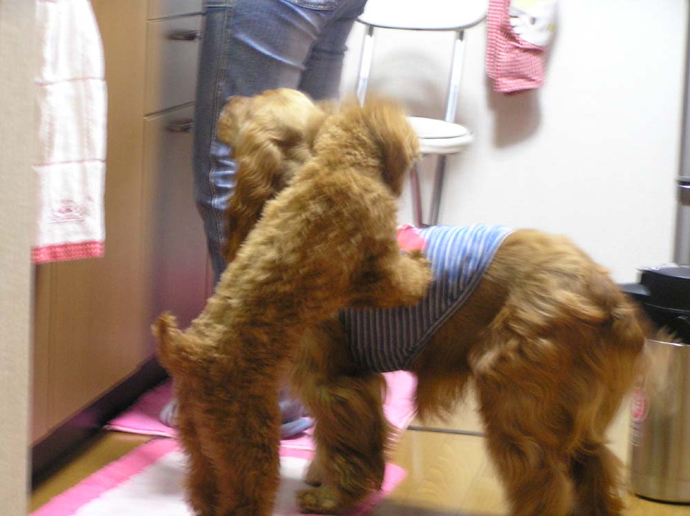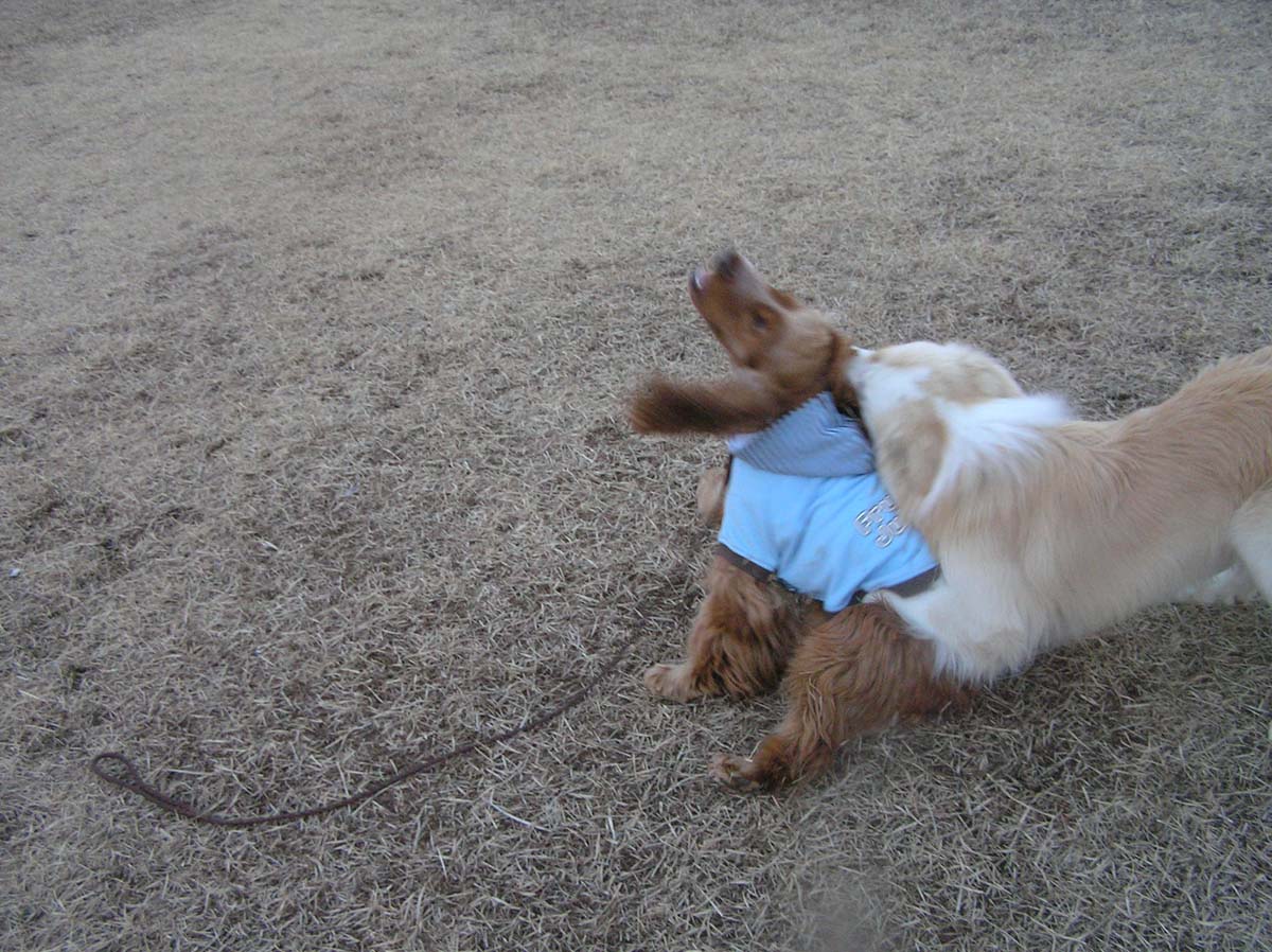 追いかけたり、追いかけられたり、そして、あま噛み攻撃!リードが絡むので、あま噛みしている双方の間に手を入れリードをとってみたのですが、その時は双方とも、一瞬お休みしてくれます。ほんとじゃれあって楽しそうです。