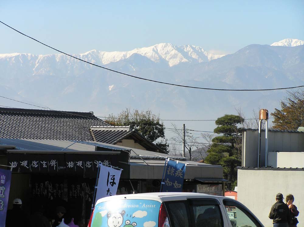 神社を出ると、茶店が・・・。おいしそうで温かそうなものが・・・。酒まんじゅう。食べようっと。その前に茶店の後方に見える南アルプスをカチャ!