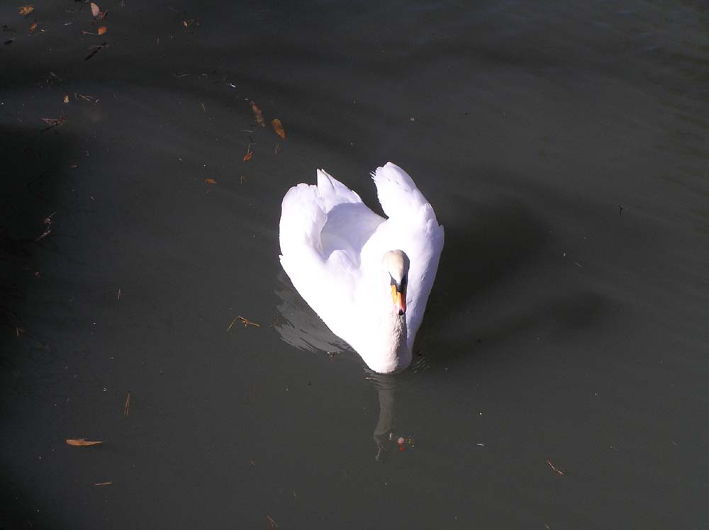 しっかり鳥居の柱の近くでウンもし、お清めのお水付近でシーもし、満足満足のビート君。太鼓橋の上でポーズをしたが、なにやら気になるものが・・・。お堀にスイスイと泳ぐ白鳥さん。