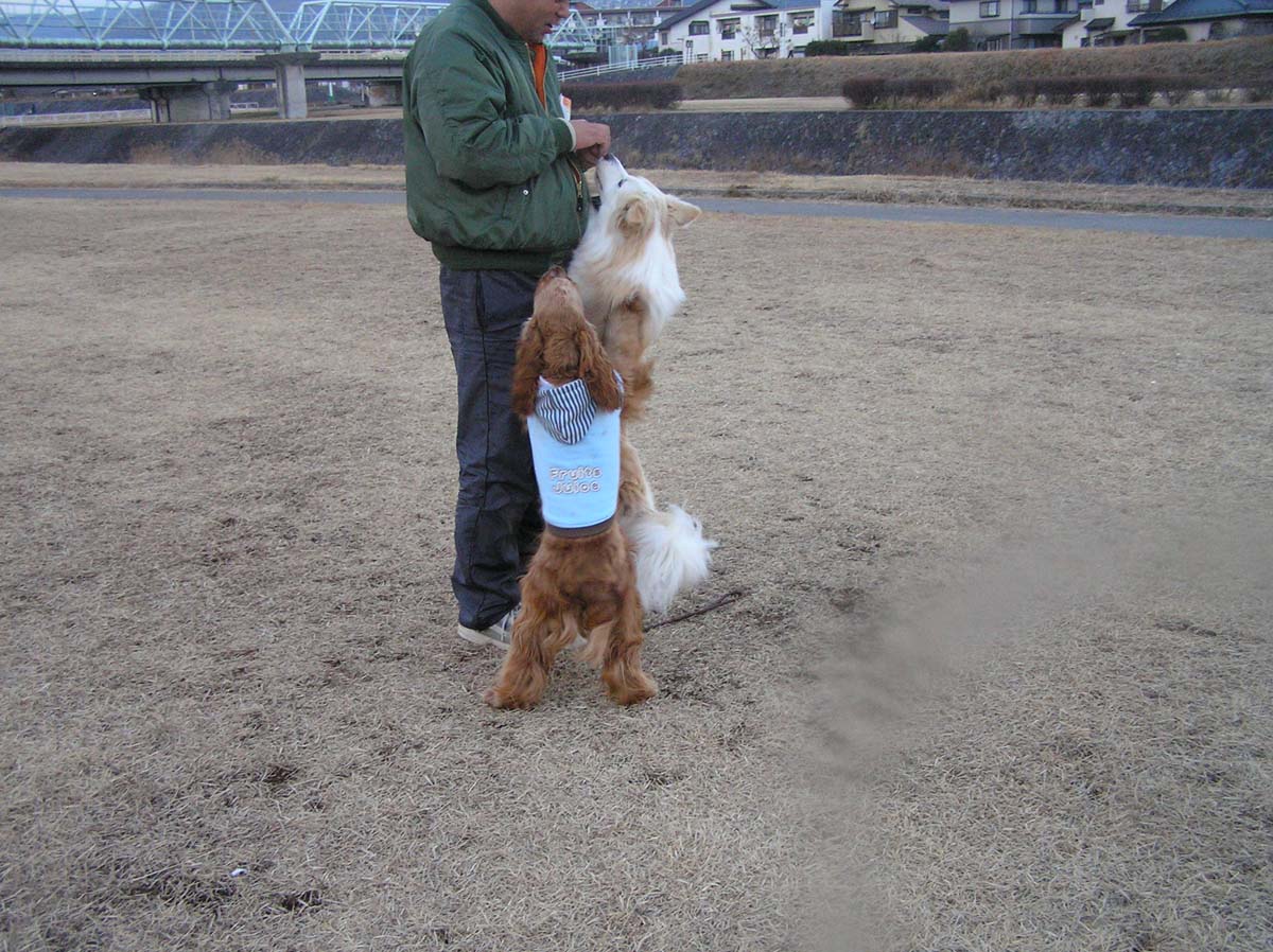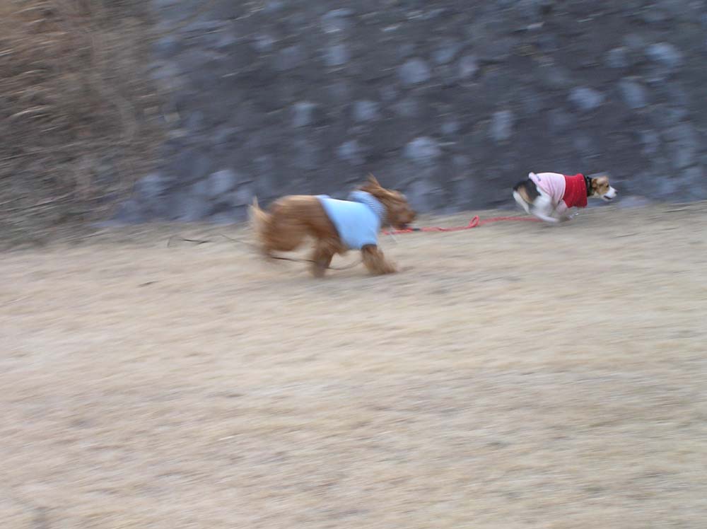 トマトちゃん(雑種6ヶ月)は、まだ数回しか会った事ないんだけど、いちばん遊びたい時期だからつきやってあげるんだ。何、言ってんの。会ったらうれしくて、どちらが先かわからないくらい同時に、しかけて遊ぶじゃないの。ごめんなさいママ。そこへ、携帯が鳴り、モカちゃんが河川敷にいるというので会い、猛ハッスル。ビートが追いかけまわし、モカちゃんの急ブレーキで方向転回。ブレーキをかけたビートがすべってモカちゃんは、ほーらこっちだよ。