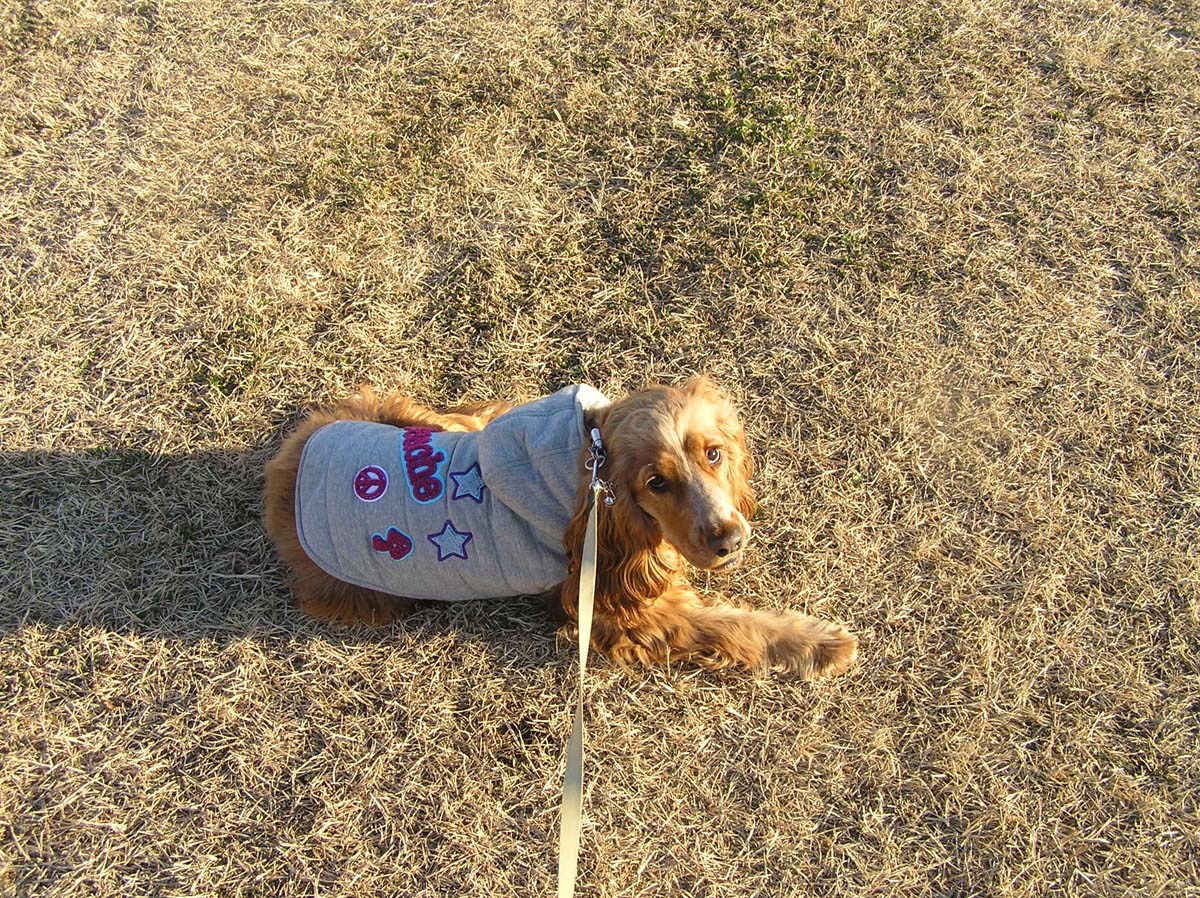 帰ってきて、熱い熱〜いビートお出迎え。早速、買った服を着て、散歩へ行こうね。ウーウー何唸ってるのビート。今ママが服を着させている所なんだから落ち着いて。と四苦八苦しながら、着せているうち、服が小さい事に気がついた。だから、唸ってたのね。仕方なくボタンをかけられる3カ所だけして、あとははずしたまま、散歩へ。なんてことでしょう。せっかく買って、サイズもOKと思ったはずが。やはり試着しないと無理なのでしょうか。こんなんじゃ絶対ネットでなんか買えないよー。意地でも着ようねビート。かわいいんだから。僕は意地でも着たくないよー。だよね。