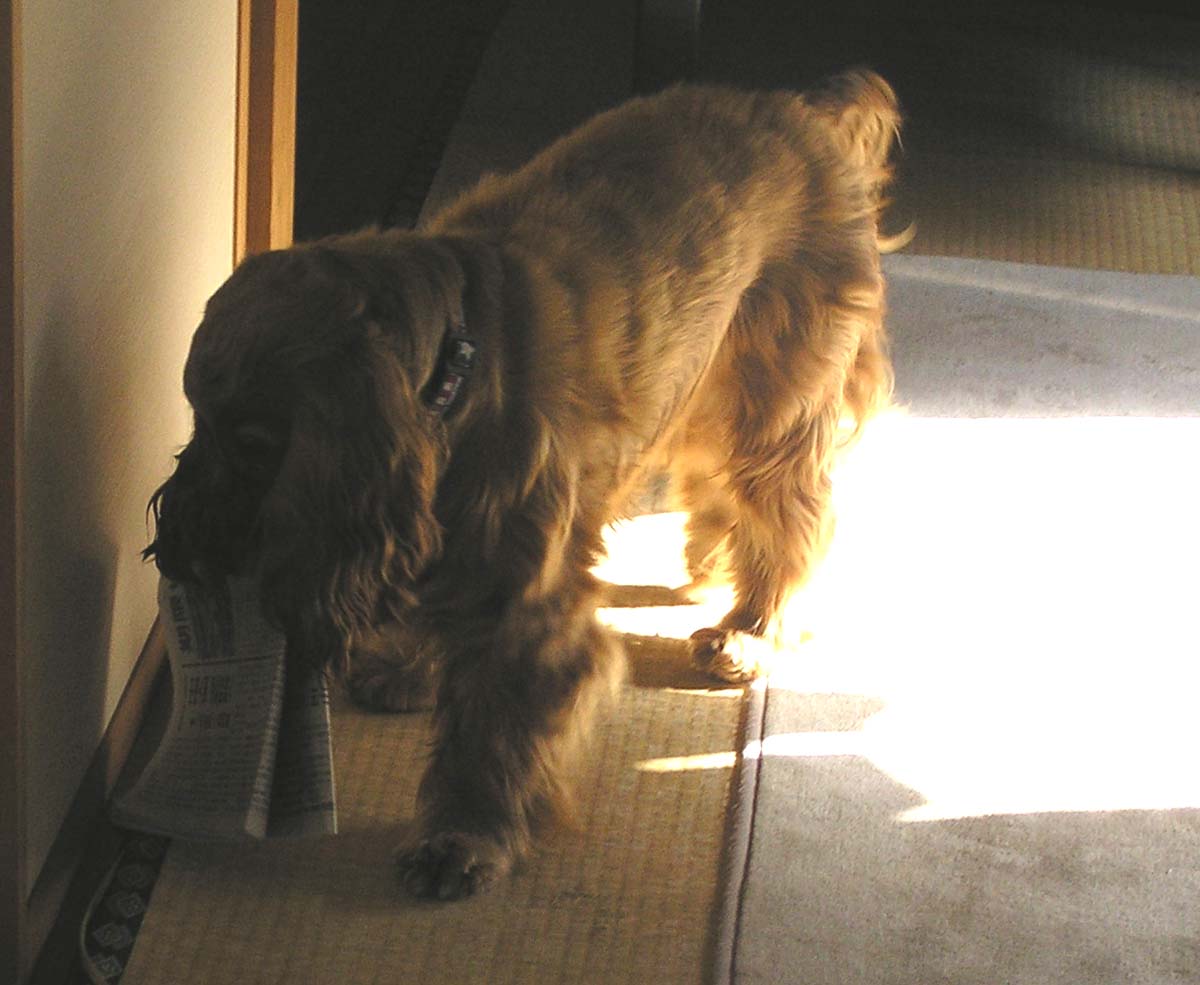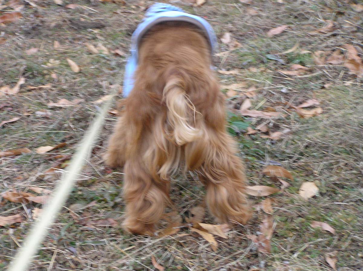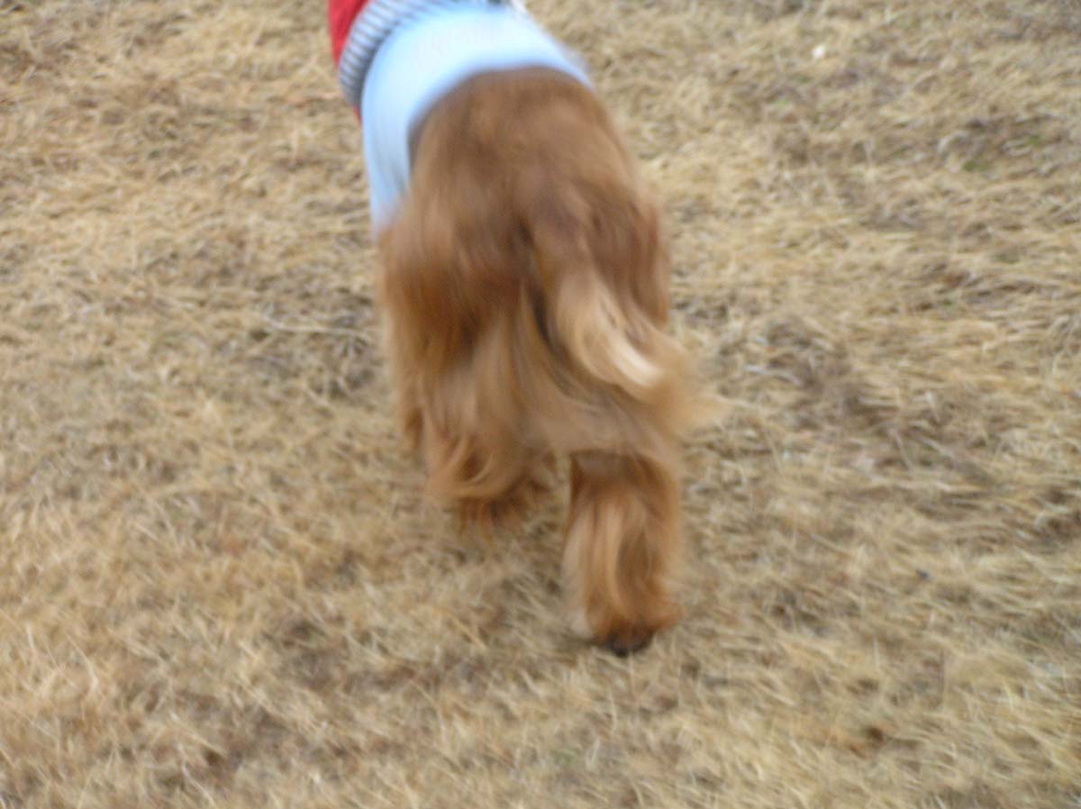 今日は雨がシトシト。お散歩出来ないかなあと思っていたら、午後は降ったり止んだりでいつもの河川敷に行ってみました。だ〜れもいません。でもビートとママは歩け歩け。ビートに、つけと言うと、何秒間か私の左横につくのですが、すぐ先に行ってしまいます。車の往来のある歩道では、リードを短くもち、つけと言ってそばにたぐりよせておきますが、河川敷ではほったらかしにできるだけしています。(と言うかママの怠慢でしつけてない)で、私はいつもビートのしっぽしか見れないのです。表情豊かなビートのしっぽ。このしっぽでいろいろ判断する訳ですが、しっぽを振りまくるにも、角度によって微妙に違うのです。ただ、うれしいと思っている時と興味があるしっぽの振り方で角度が変わります。おもしろいですよね。